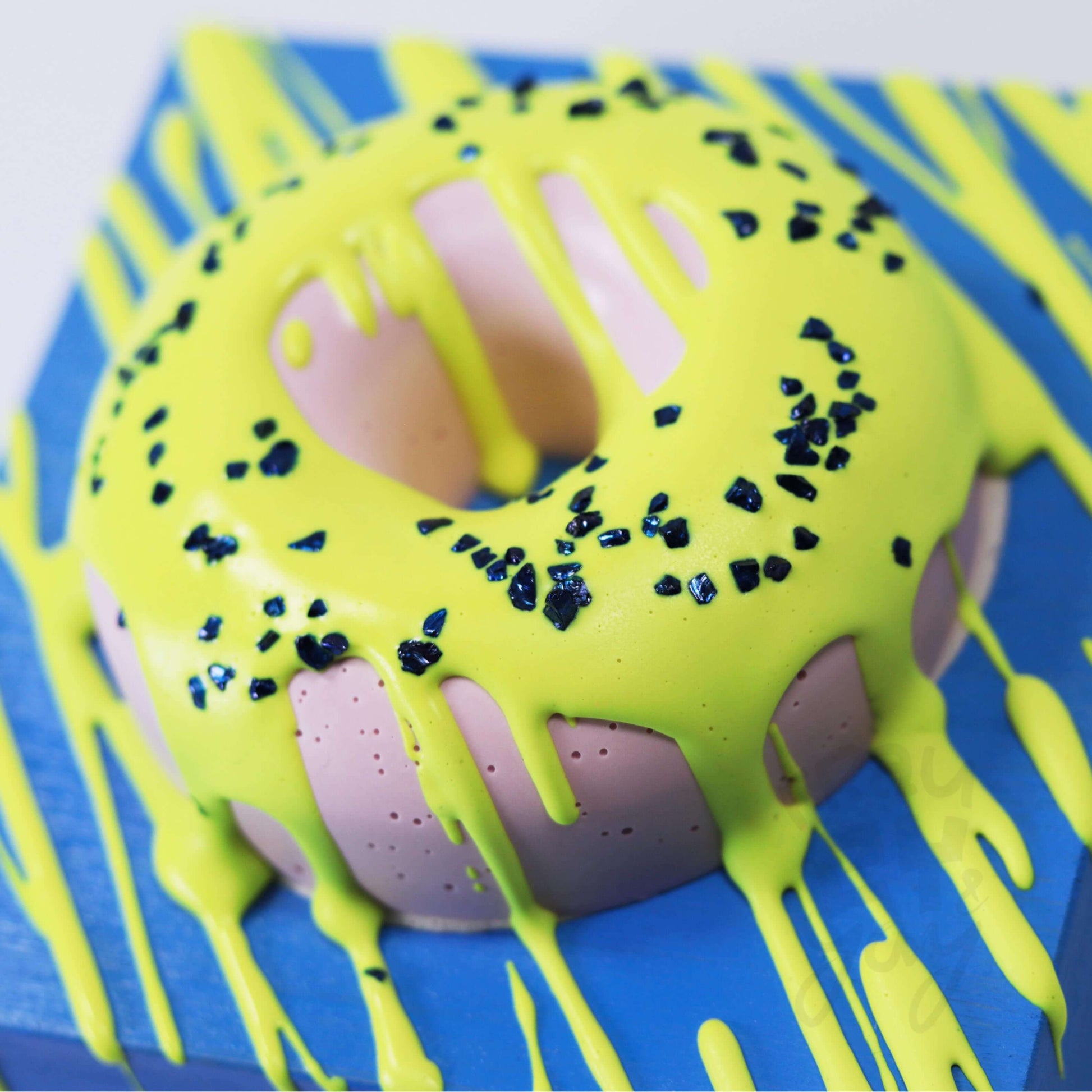 Aus Gießpulver gegossener 3D Donut, auf Massivholzblock.