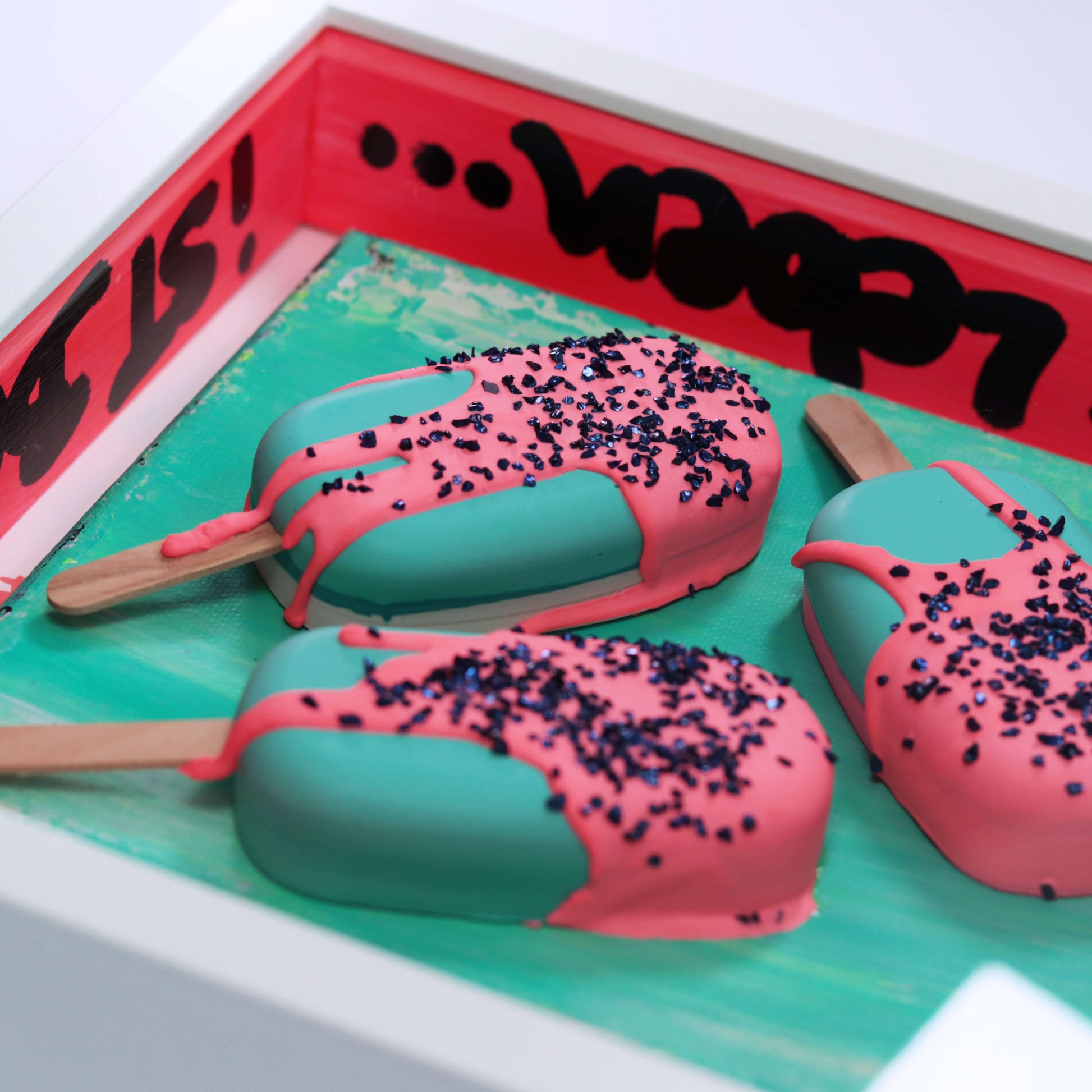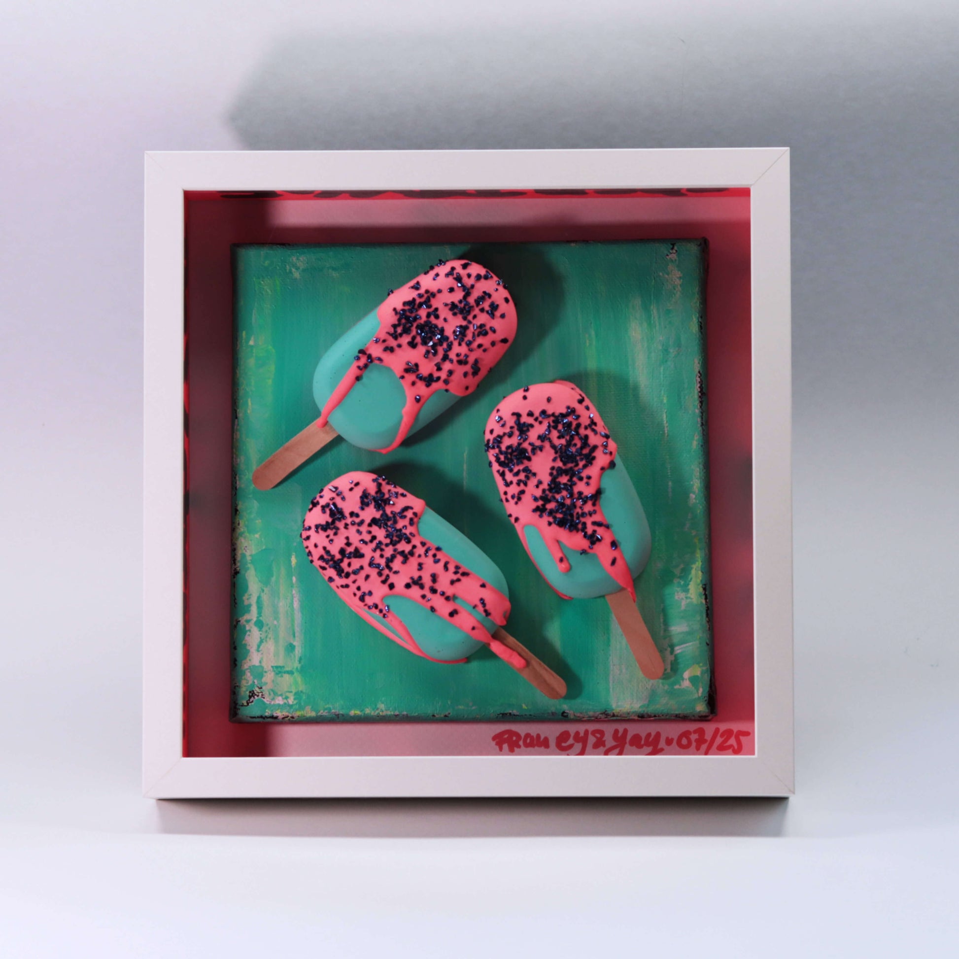 3D Eis Skulptur im Schaukasten Rahmen mint-pink