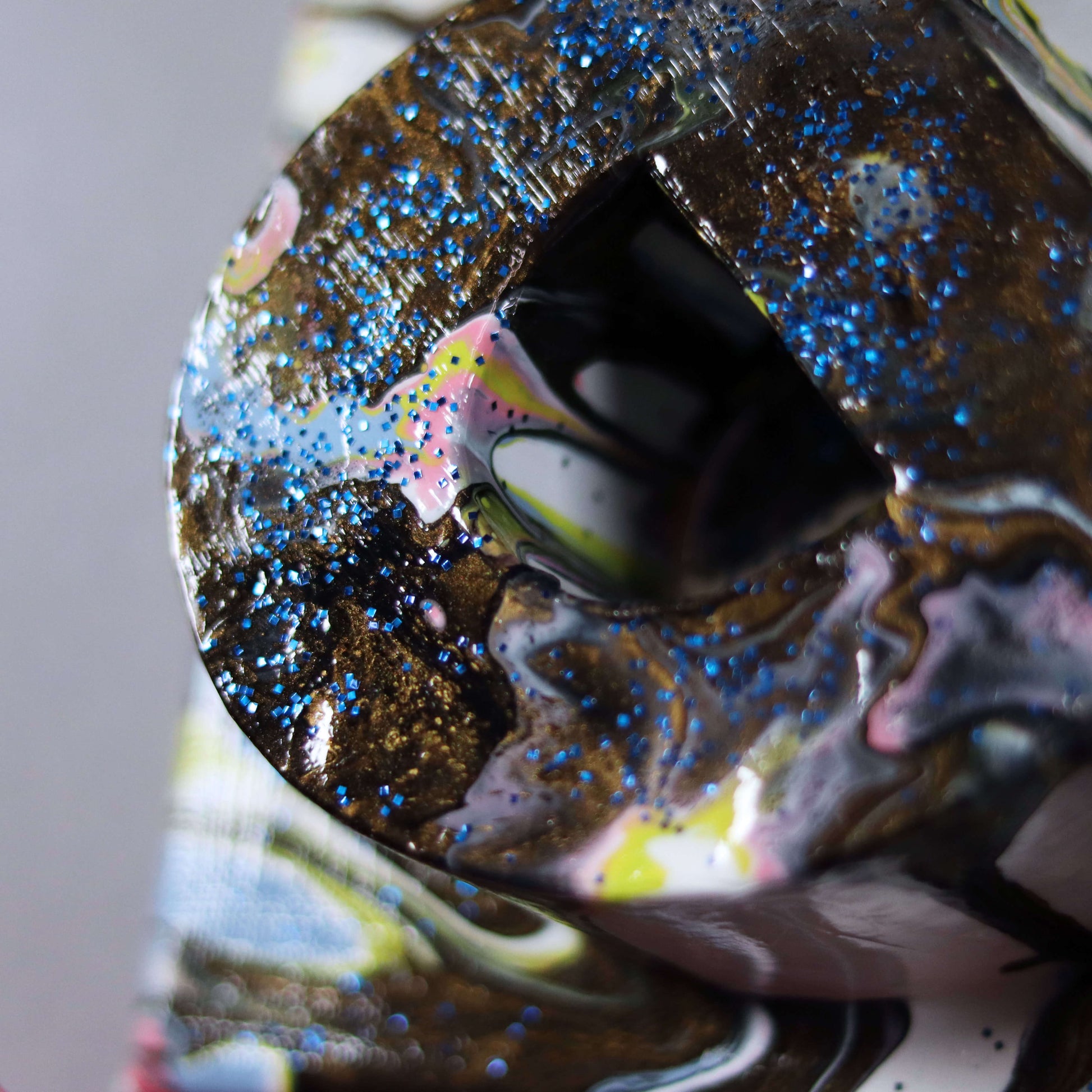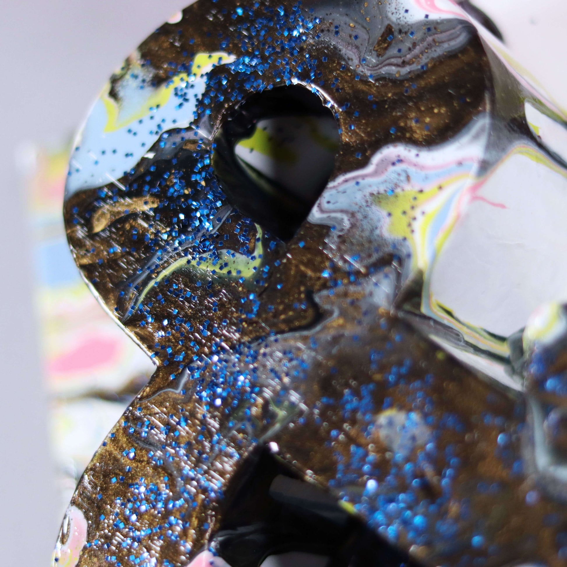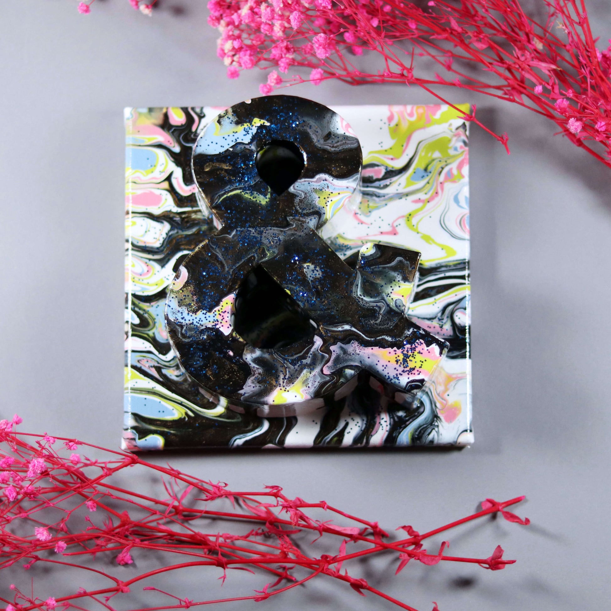 Dieses 3D-Acrylpouring-Kunstwerk auf Leinwand trägt ein Symbol, das alles verbindet: das „&“-Zeichen. Es hebt sich plastisch aus dem Farbenspiel heraus, eingebettet in fließende, miteinander verschmolzene Nuancen aus Schwarz, Gold und leuchtenden Tönen – wie ein geheimnisvoller, funkelnder Donut, der Geschichten erzählt.