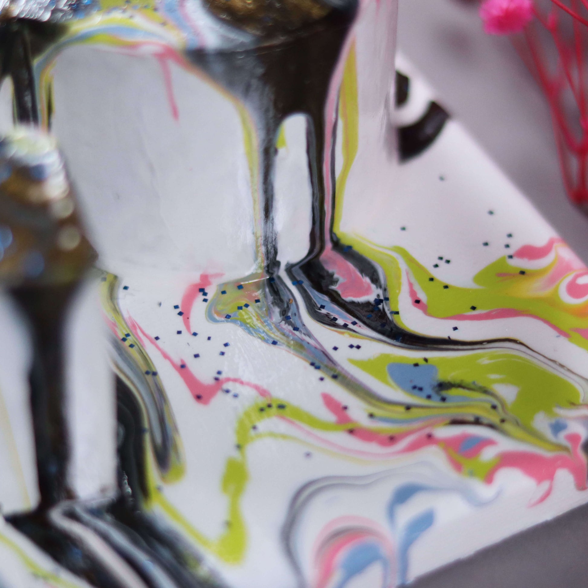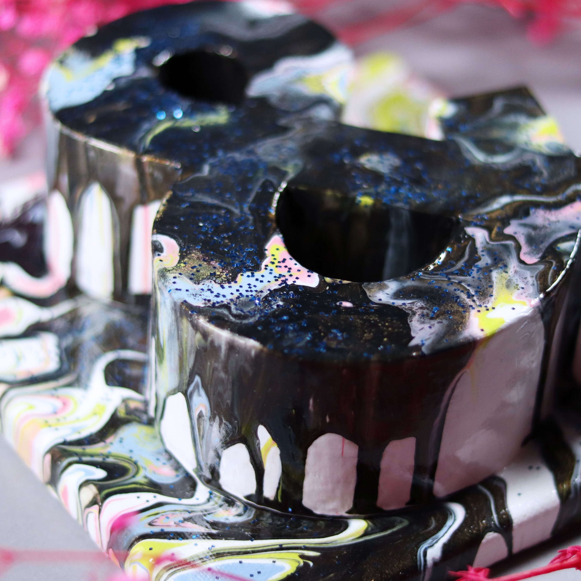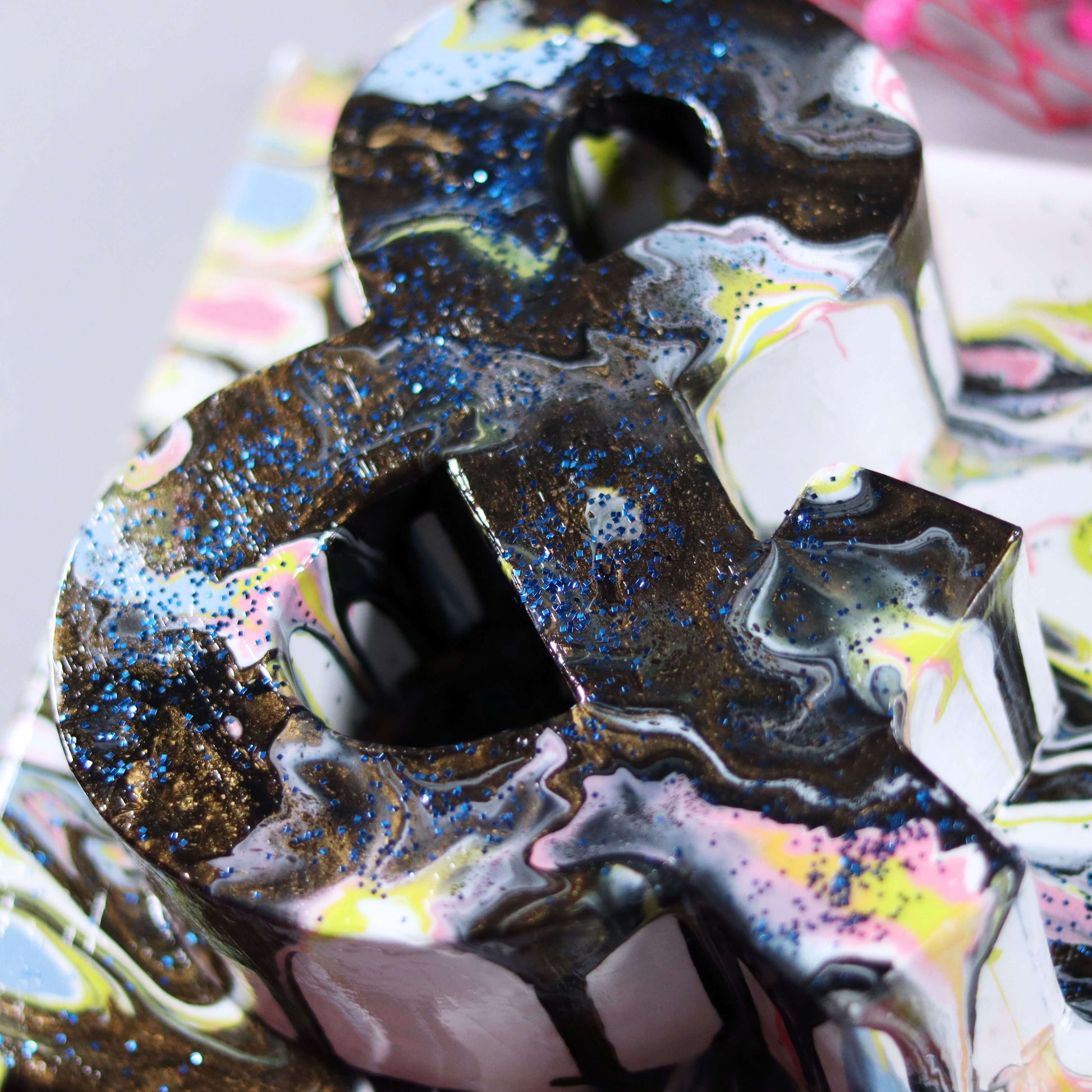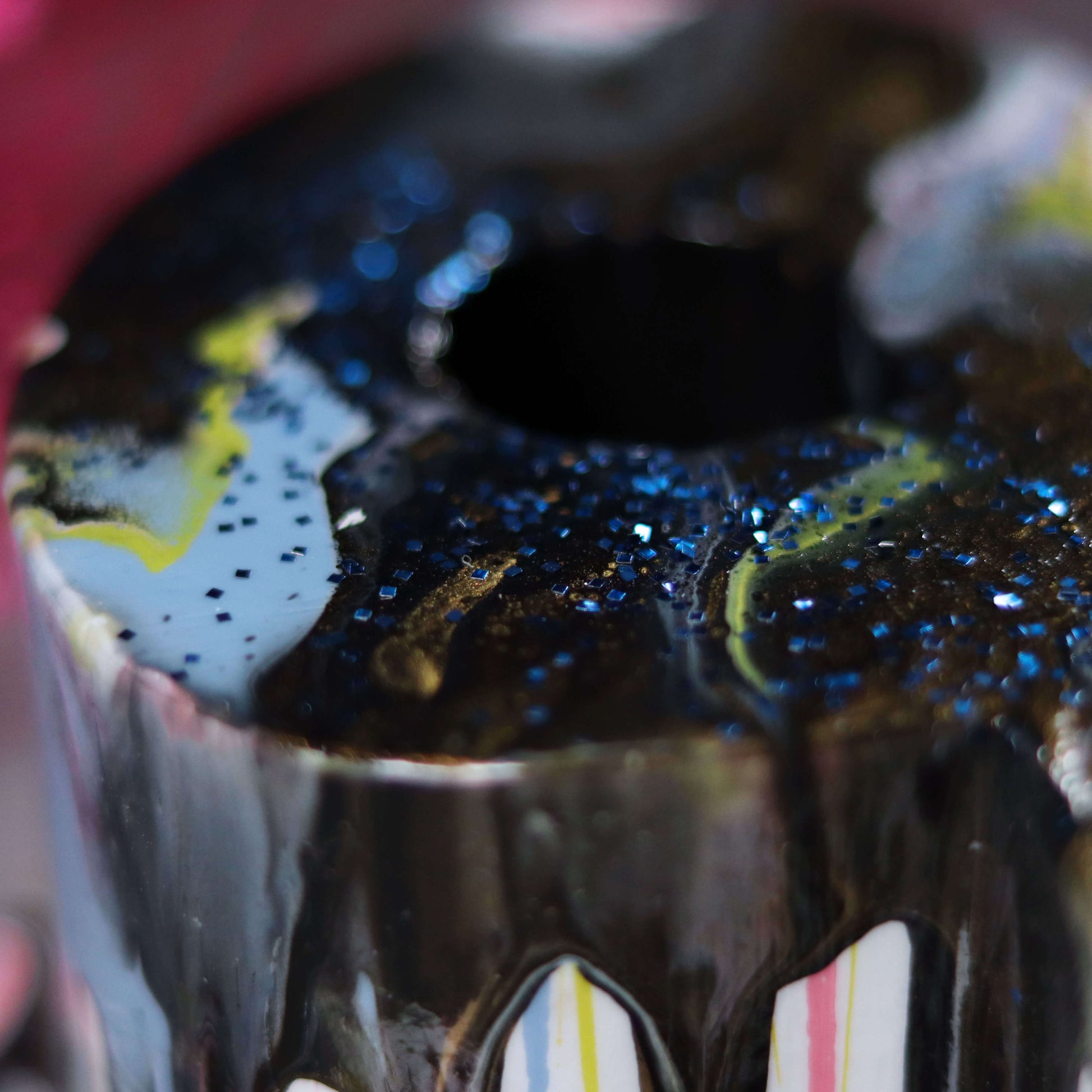 Dieses 3D-Acrylpouring-Kunstwerk auf Leinwand trägt ein Symbol, das alles verbindet: das „&“-Zeichen. Es hebt sich plastisch aus dem Farbenspiel heraus, eingebettet in fließende, miteinander verschmolzene Nuancen aus Schwarz, Gold und leuchtenden Tönen – wie ein geheimnisvoller, funkelnder Donut, der Geschichten erzählt.