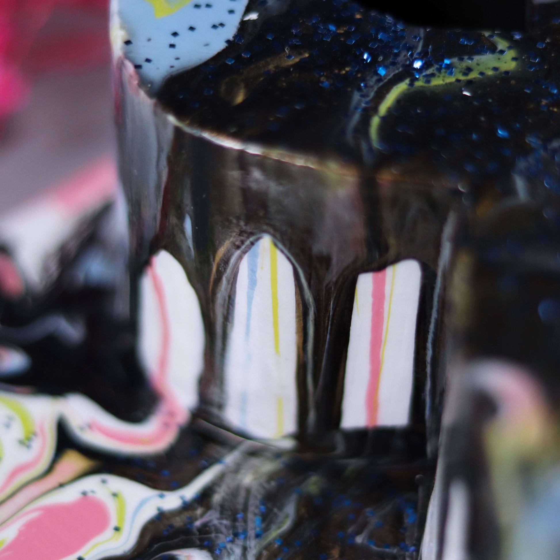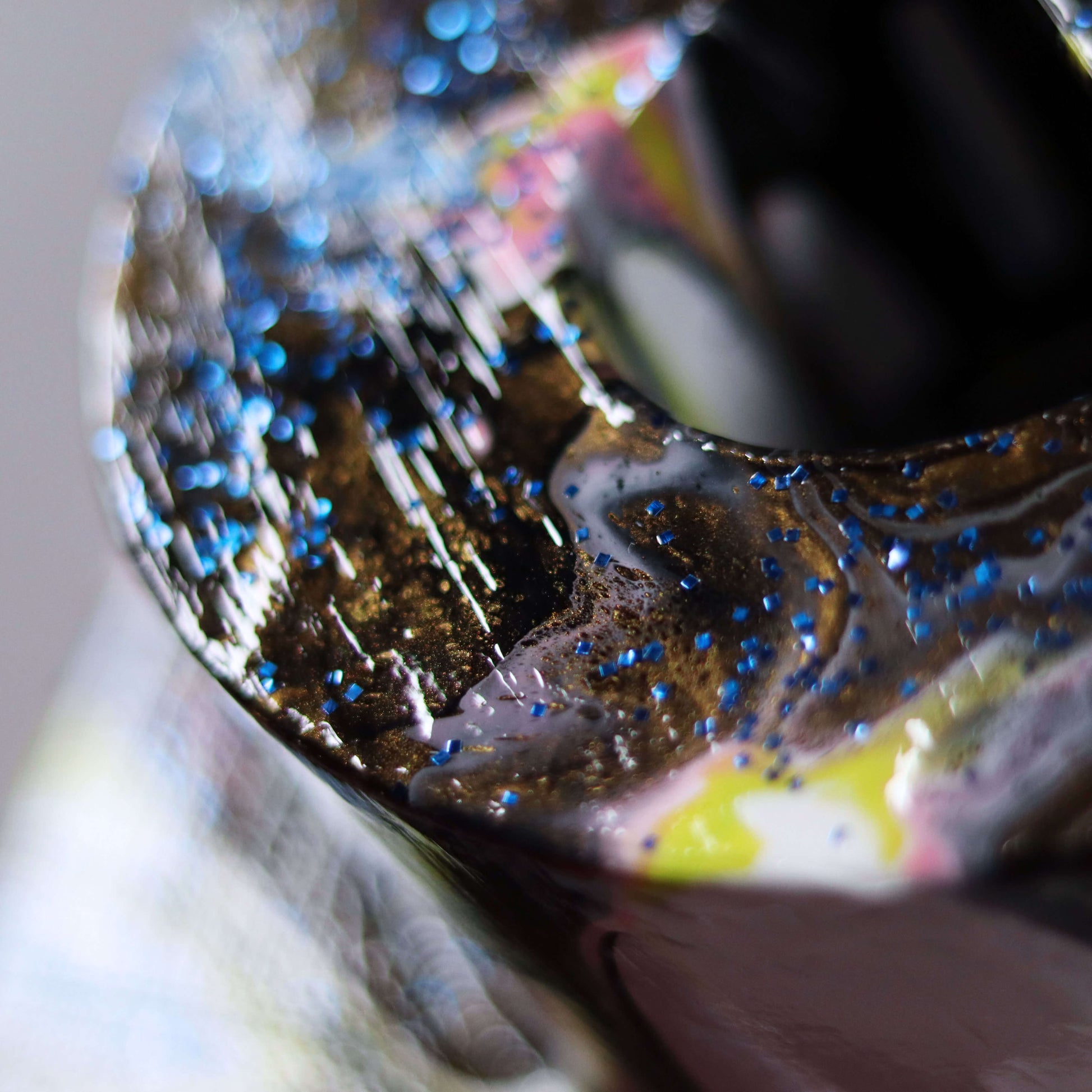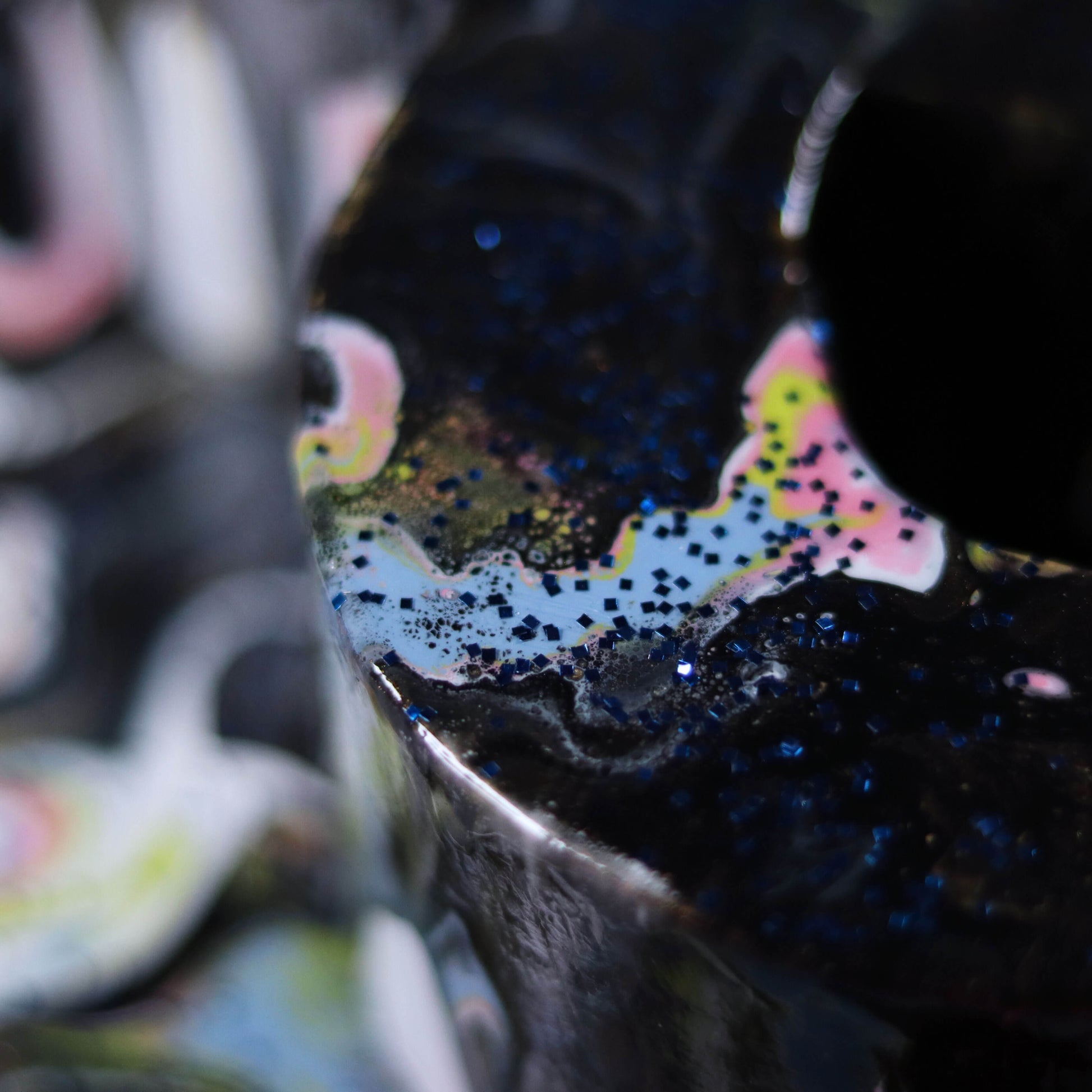 Über allem liegt ein Hauch von blauem Glitzer, der je nach Lichteinfall geheimnisvoll schimmert – mal dezent, mal strahlend. Ein Spiel aus Tiefe, Bewegung und Licht, das das Bild lebendig macht.